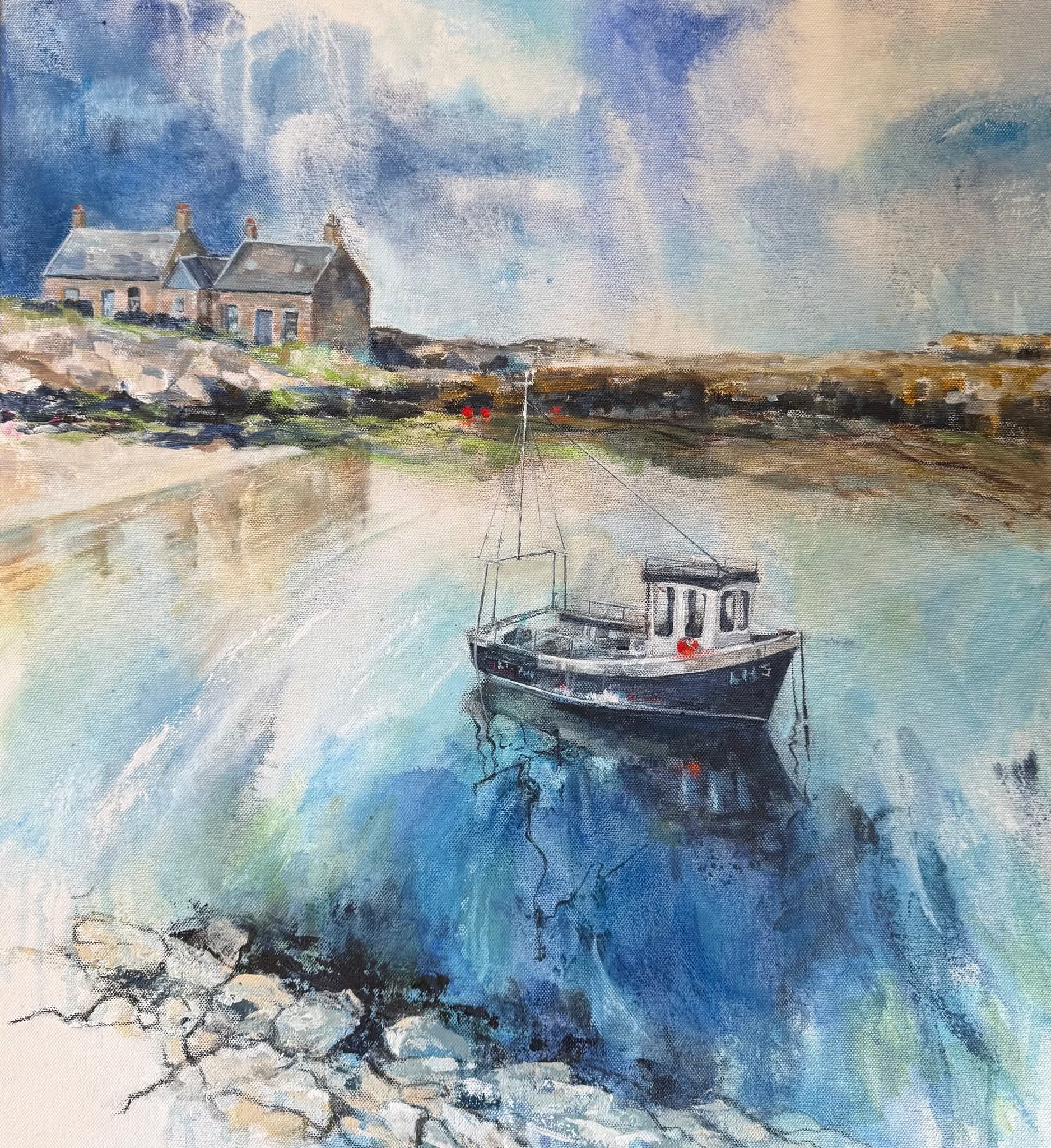 Another artist ‘new’ to Marshchapel is Catherine Nicholson who studied Fine Art Sculpture in Manchester and subsequently Bronze Casting at the Royal College of Art in London. She has been painting for many years and teaching Art, Design and Additional Support Needs in Secondary Schools in Scotland. She has recently moved back to her home County of Lincolnshire to develop her art. Welcome Catherine. We look forward to seeing your watercolour paintings which capture the exquisite detail and beauty of the natural world alongside this acrylic work of Fisherman’s Cottages.